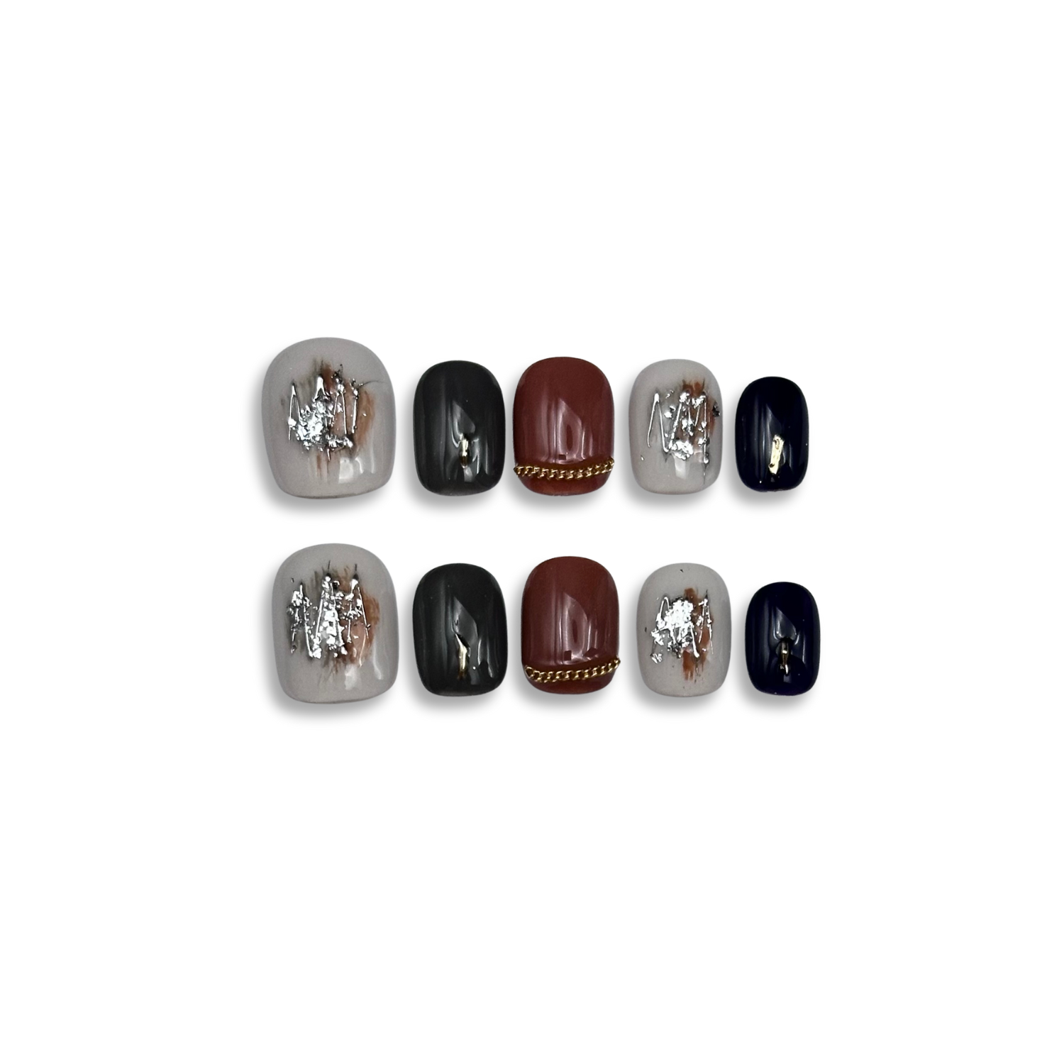 Rich brown, soft grey, and deep onyx come together in Rust, an earthy yet refined mix accented with metallic silver and a touch of chain detail. It feels grounded but bold — an artistic balance between natural texture and modern design.