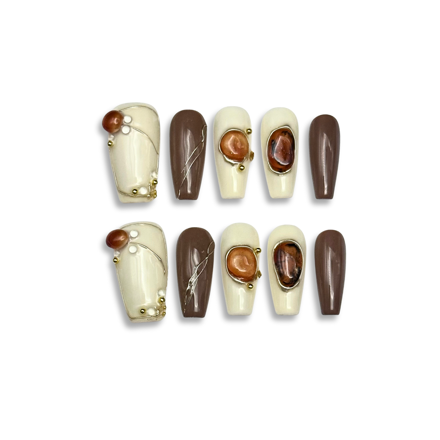 Terra grounds you in natural elegance — creamy beige paired with chocolate brown and amber-like gems framed in gold. The textured stones bring depth and warmth, creating a look that feels organic, earthy, and luxurious.