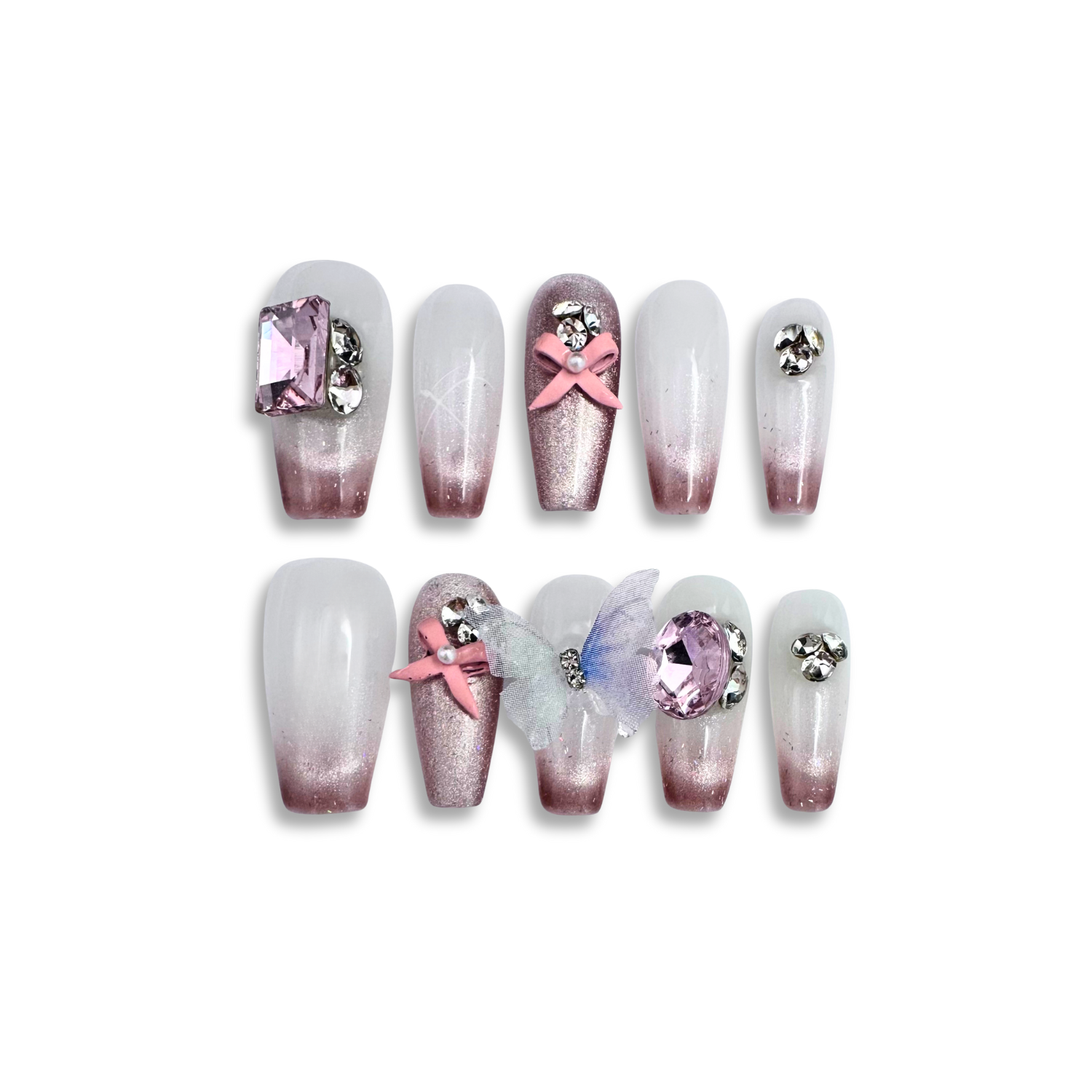 ✔️ Sparkling ombre base with 3D bow and butterfly details