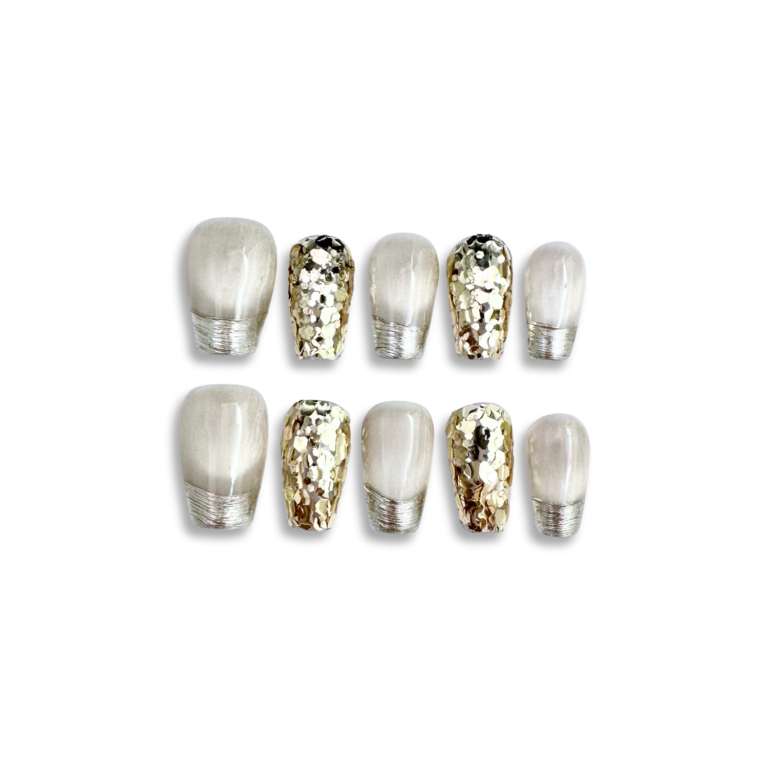 Éclat — meaning “sparkle” — is pure celebration in a set. With champagne-toned glitter and silver-tipped edges, it’s designed for those who love to shimmer with confidence. A statement piece that instantly lifts your mood (and outfit).