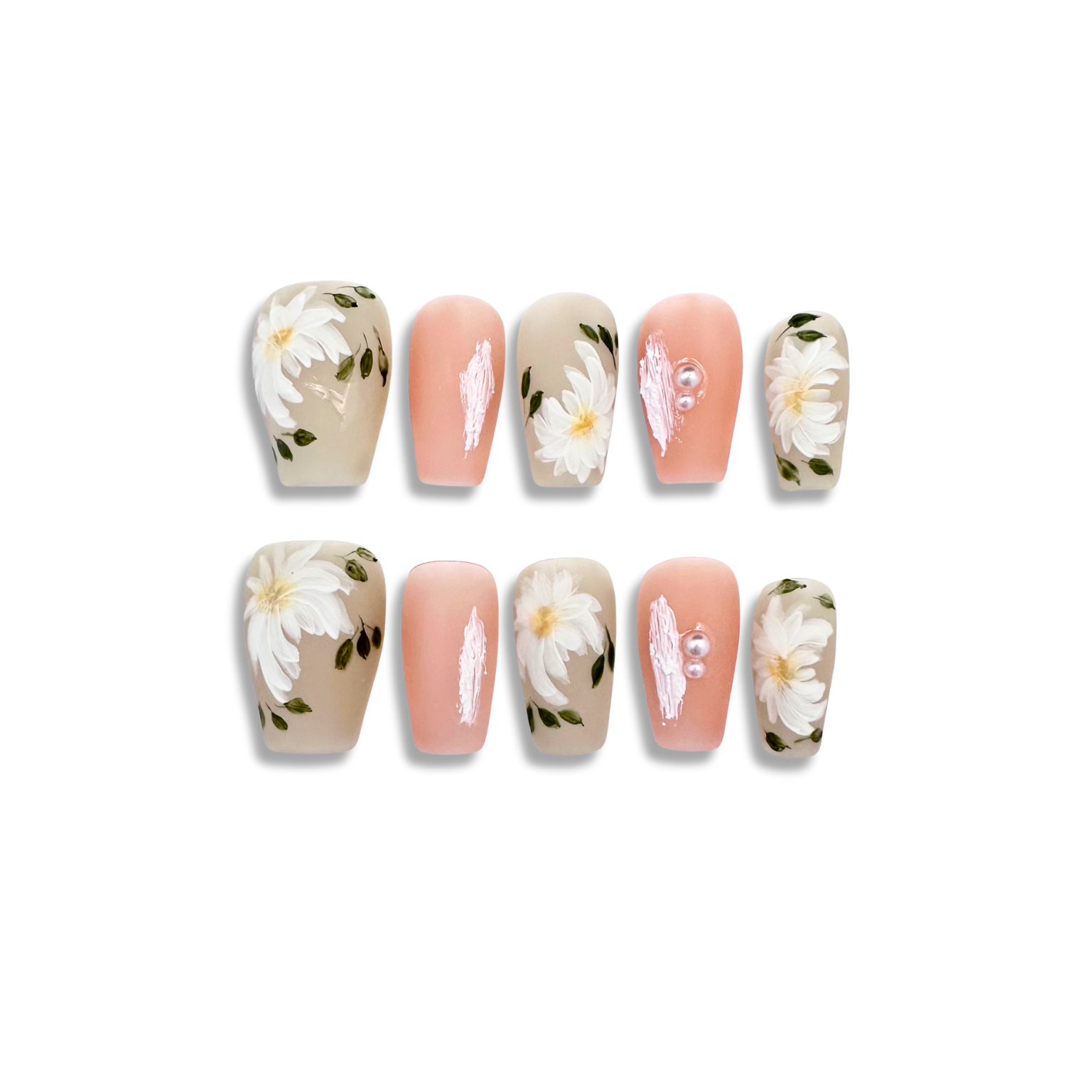 Meet Chrysanthemum—a celebration of floral artistry with delicate hand-painted mums blooming across a matte white canvas. The look is perfectly balanced with two abstract beige nails featuring playful white splashes, creating a modern twist on garden-inspired elegance. Designed for champagne picnics and sunny afternoons, these nails bring just the right mix of artistry and airy charm.