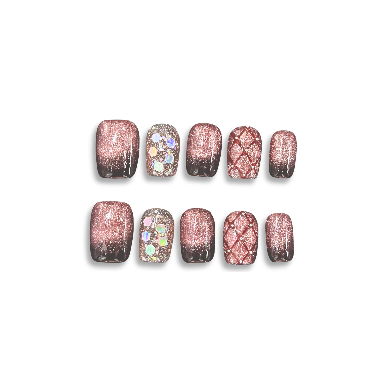 Meet Velvet—a celestial explosion of deep crimson glitter, so densely packed it looks like crushed rubies. Every nail is a different cosmic fantasy: some feature sharp diamond-shaped glitter clusters, others boast reflective French tips that glow like neon signs, while a few are dusted with iridescent petal flakes that shift from red to gold. This is drama perfected—the kind of manicure that turns heads without saying a word.